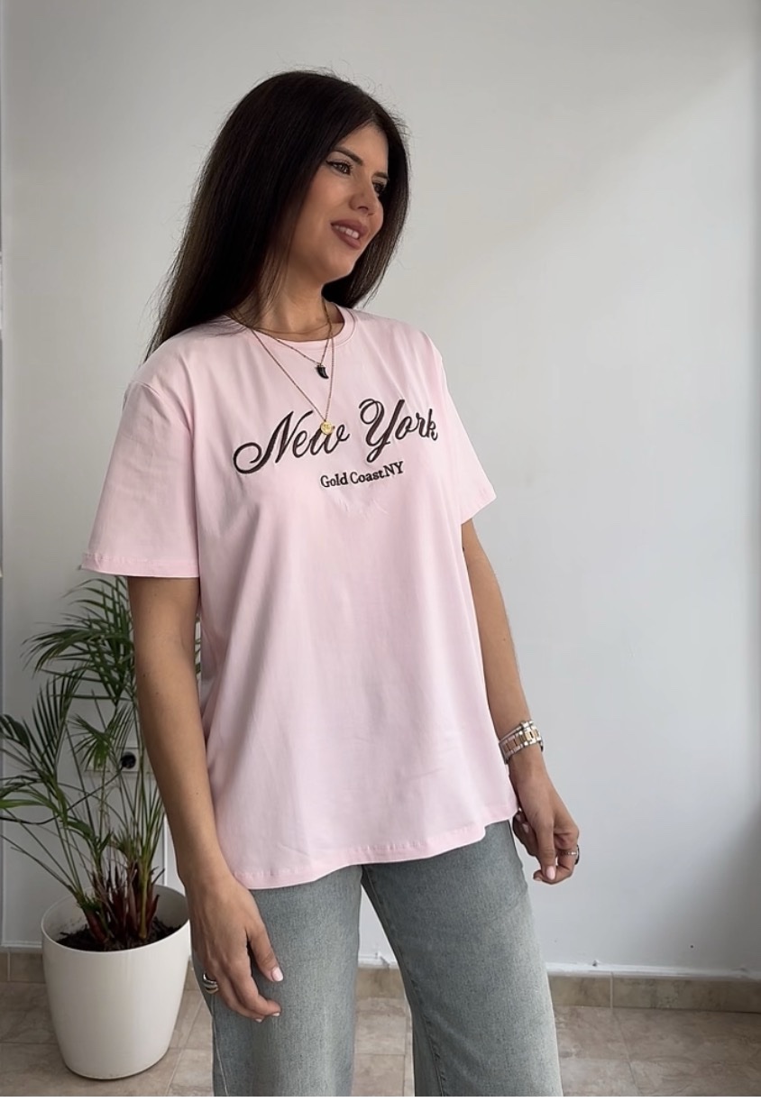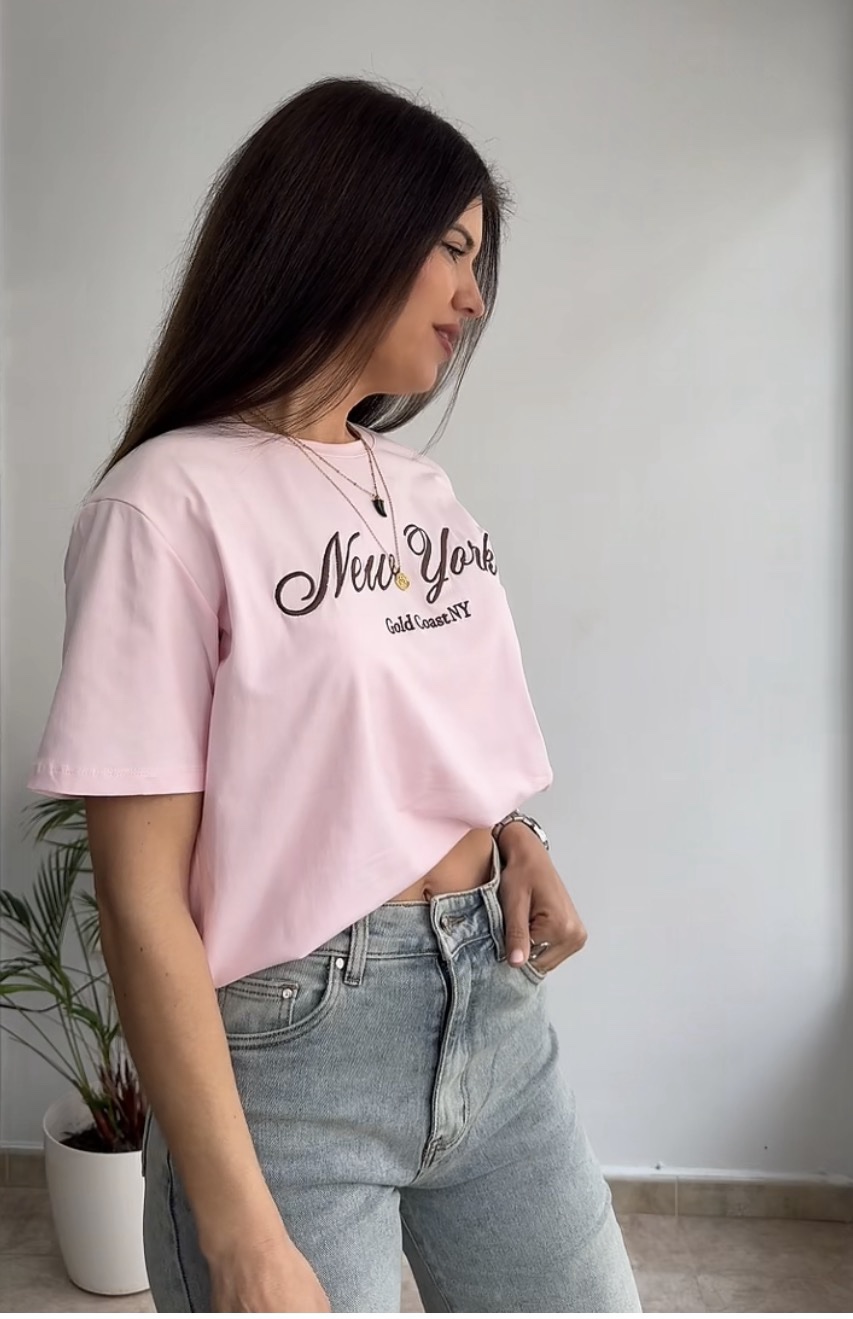 Camiseta rosa letra bordada cantidad