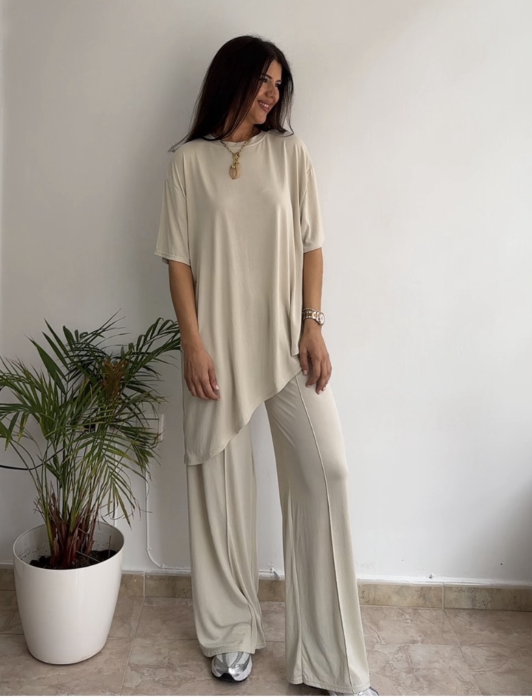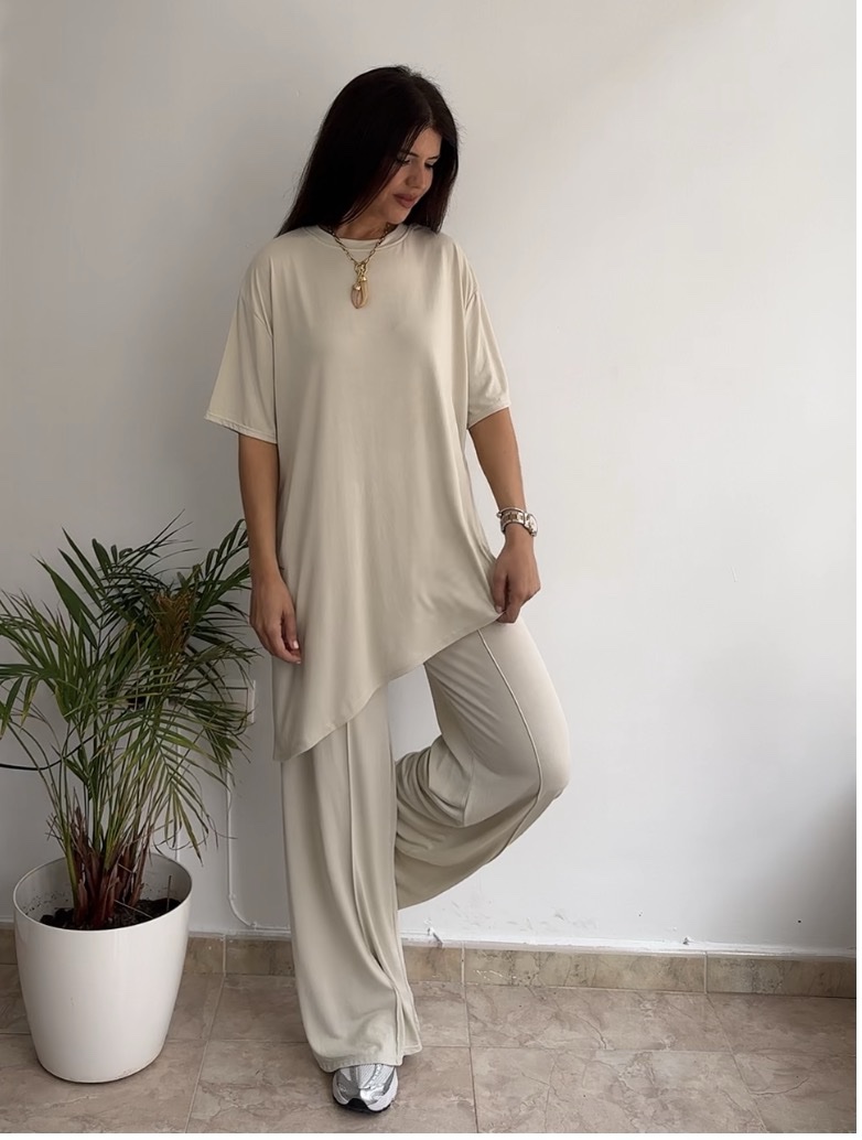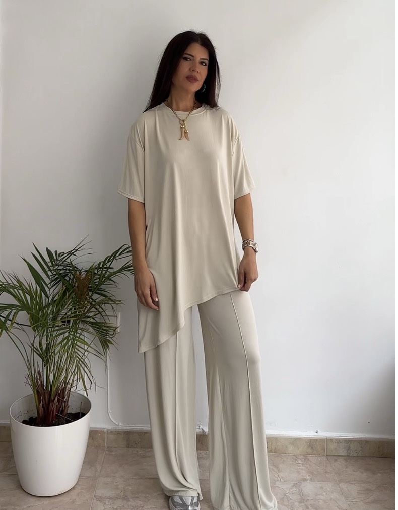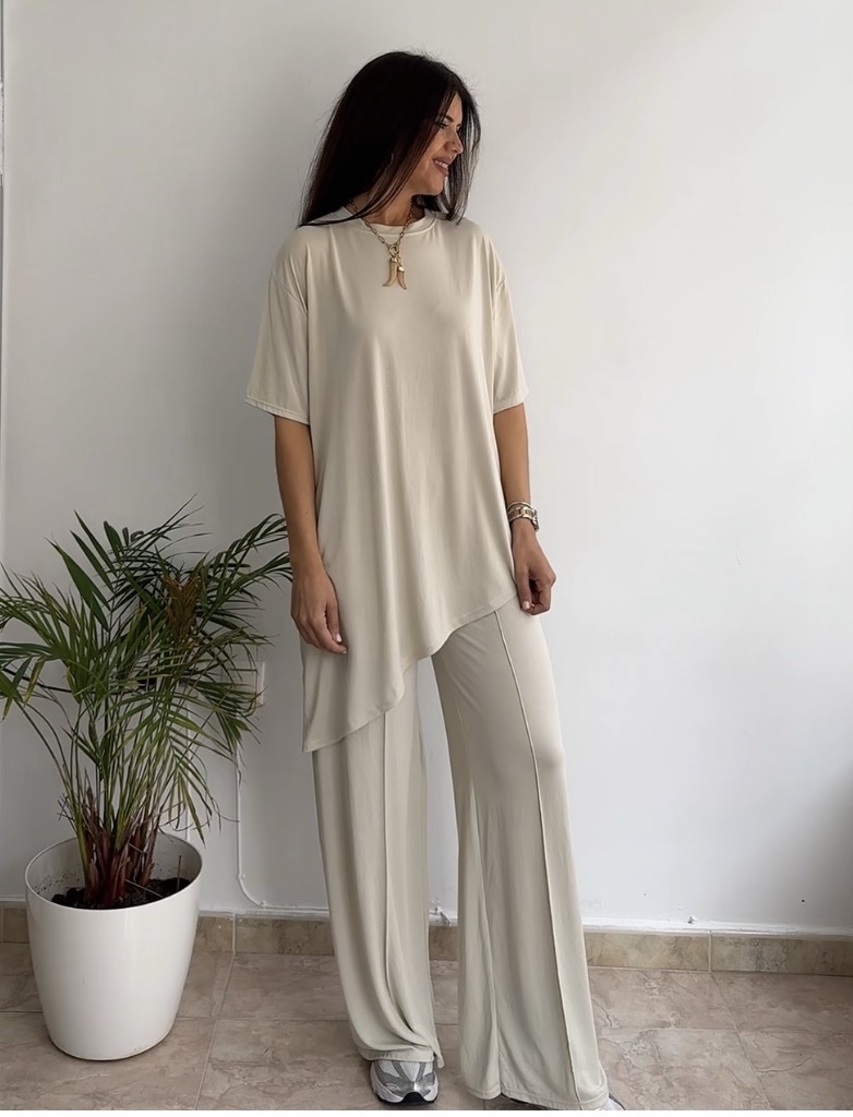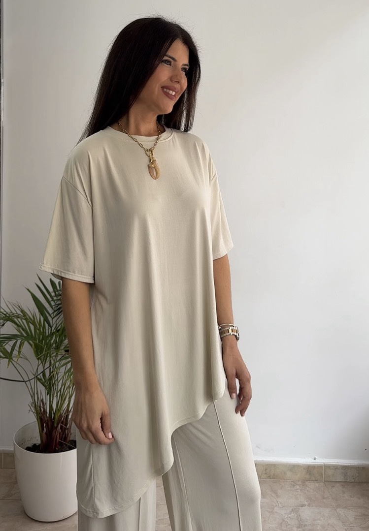 Conjunto asimétrico licra fría beige