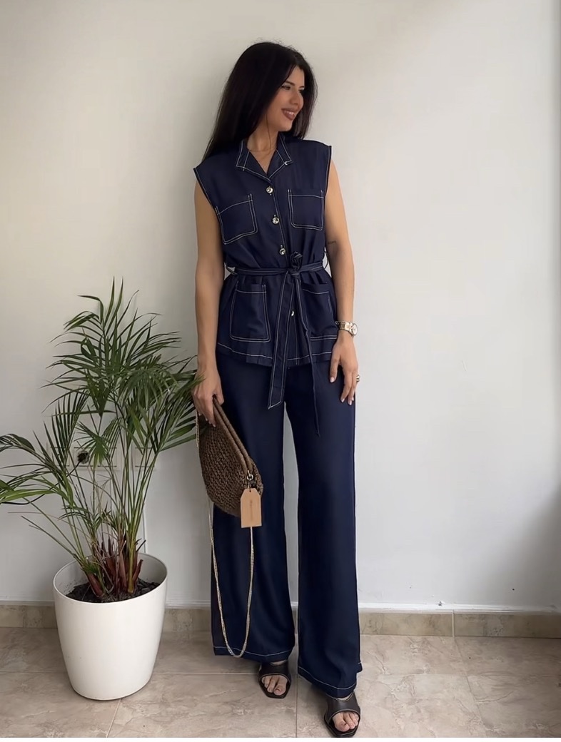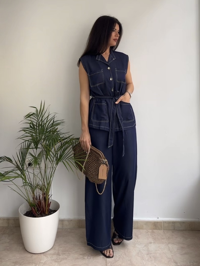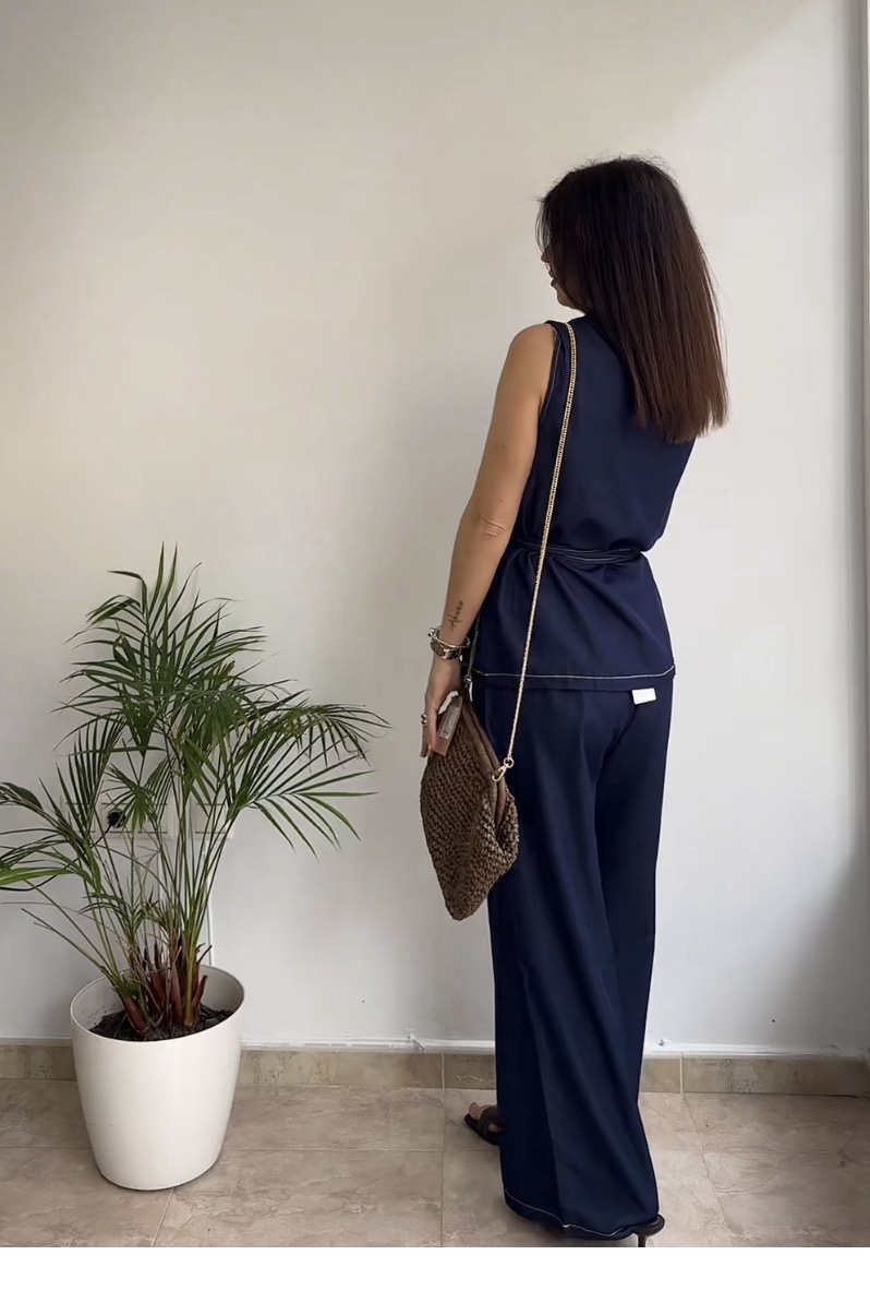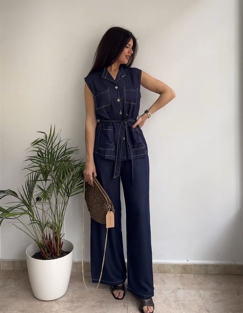 Pantalón con botones y cremallera goma elástica en la parte de atrás del pantalón.