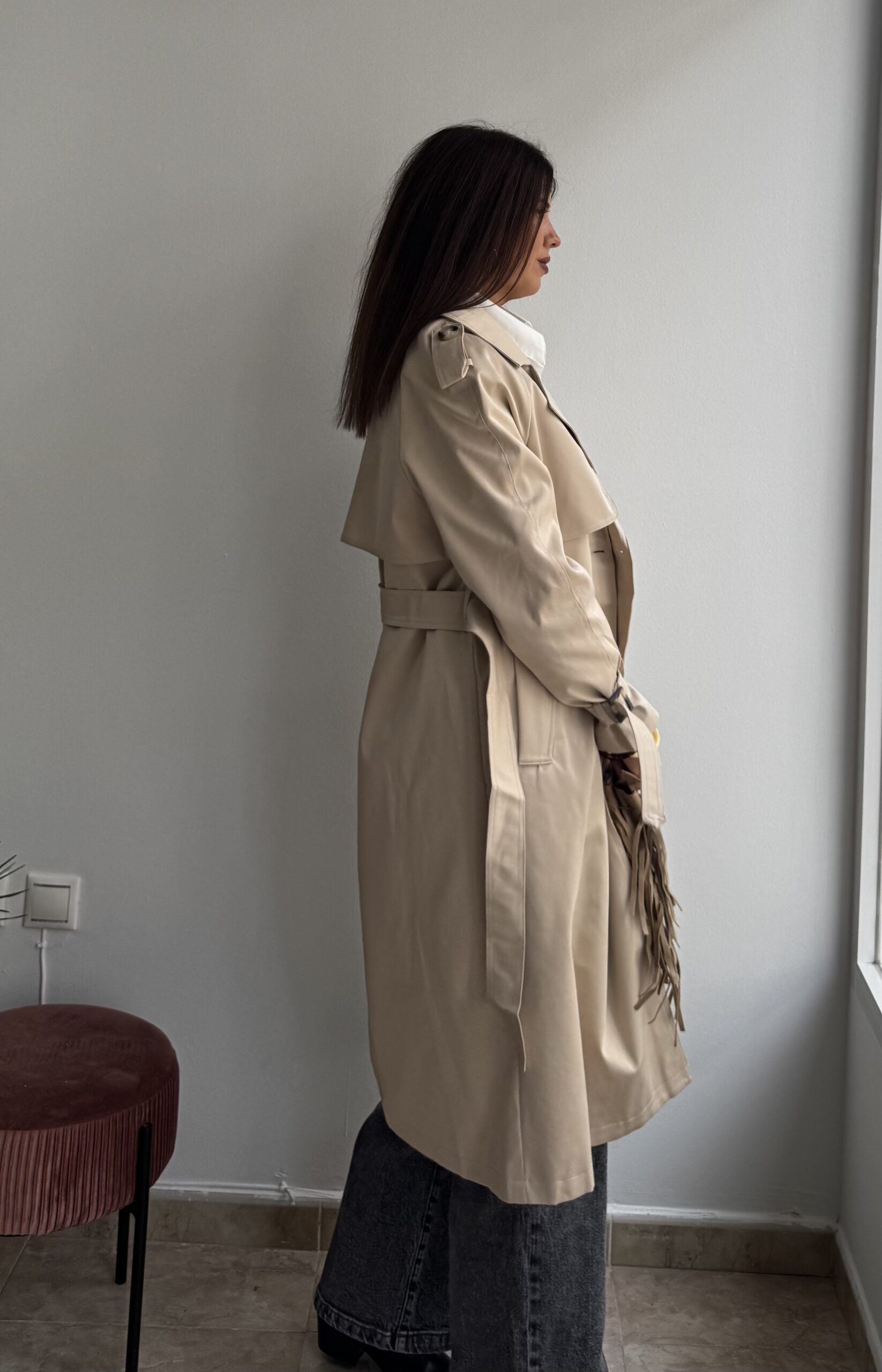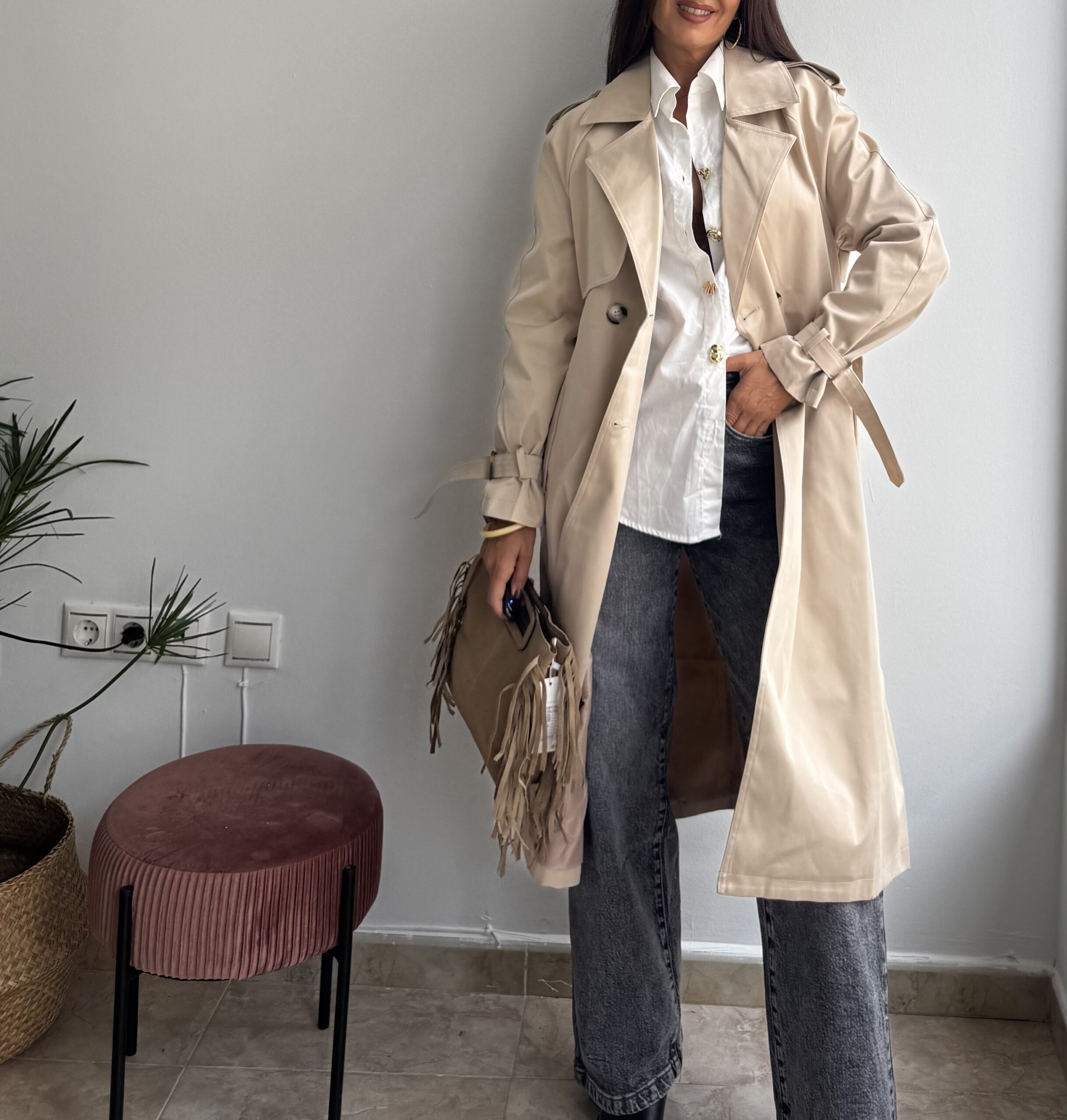 GABARDINA EN COLOR BEIGE, FORRADA. CINTURON EN LOS PUÑOS Y EN EL CINTURA.