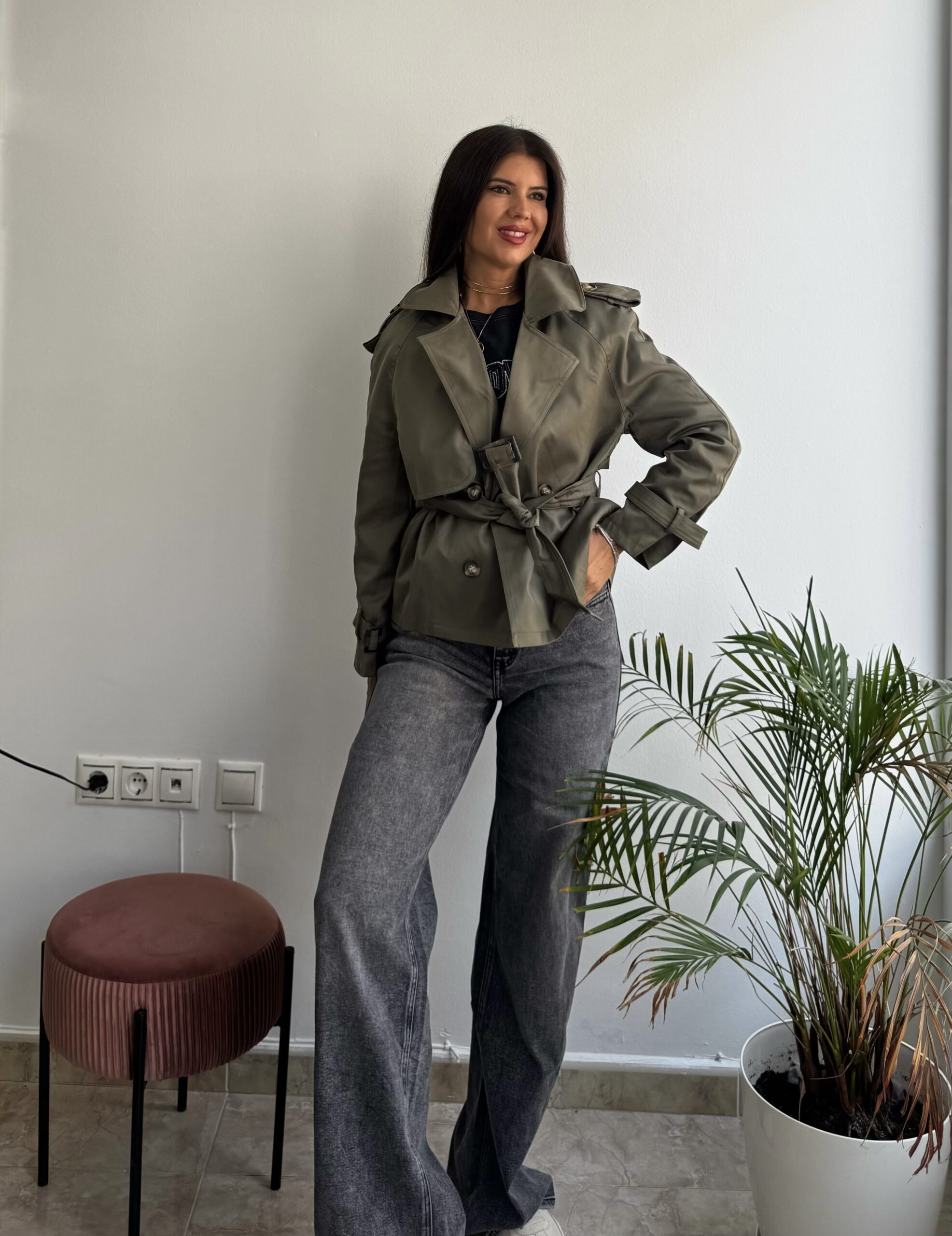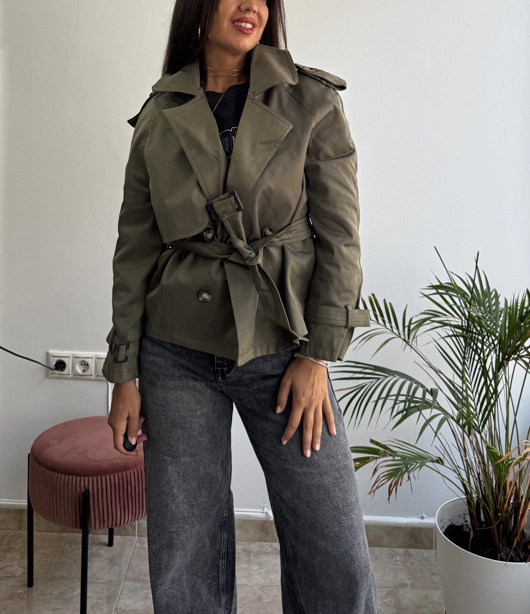 CHAQUETA FORRADA CON TAPETE ENLA PARTE DE ATRAS, CINTURON EL LA CINTURA Y EN LOS PUÑOS.